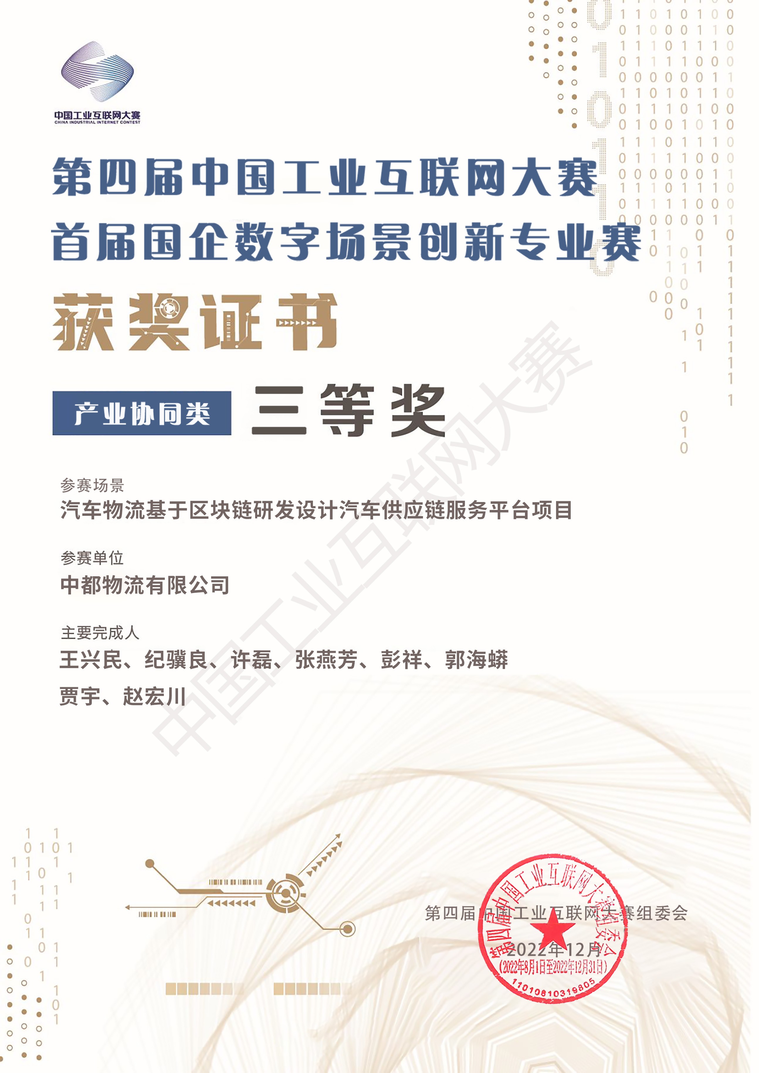 近日,由國務(wù)院國資委、工業(yè)和信息化部、中華全國工商業(yè)聯(lián)合會、浙江省人民政府聯(lián)合主辦的第四屆中國工業(yè)互聯(lián)網(wǎng)大賽結(jié)果正式揭曉,中都物流有限公司提報的“汽車物流基于區(qū)塊鏈研發(fā)設(shè)計汽車供應(yīng)鏈服務(wù)平臺”項目在國企數(shù)字場景創(chuàng)新專業(yè)賽中斬獲三等獎。