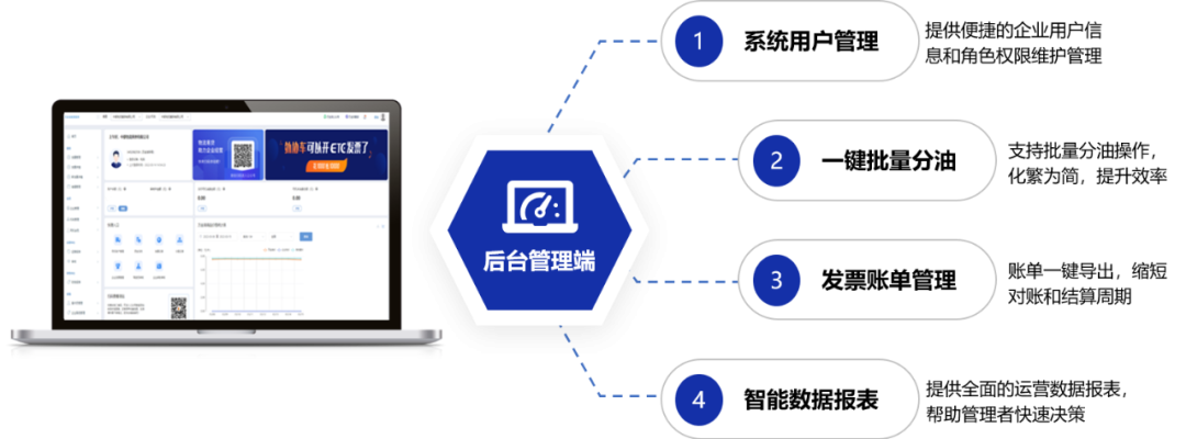 管理者可使用管理后臺,完成用戶信息維護(hù)、一鍵分油、結(jié)算對賬和數(shù)據(jù)監(jiān)控分析等精益化管理動作。