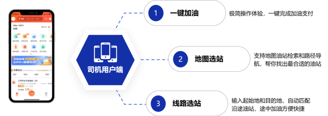 司機(jī)用戶可使用手機(jī)APP,輕松完成線路規(guī)劃、油站檢索、路徑導(dǎo)航和一鍵加油等一系列智能化的加油操作。
